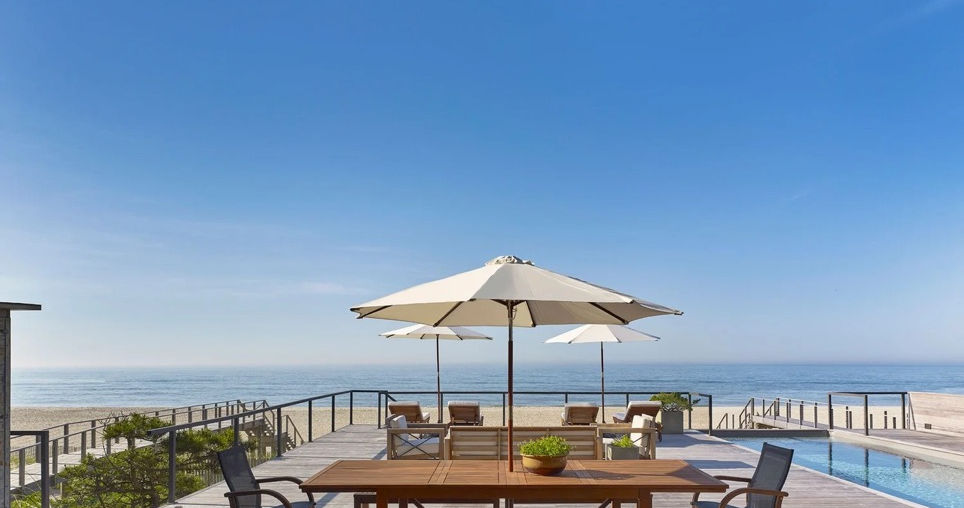 Beautifully restored, a most exciting offering on the Fire Island oceanfront. A cathedral-like great room features floor-to-ceiling doors that open to the generous sundeck with its heated infinity pool and hot tub overlooking the ocean, ideal for entertaining. This sun-drenched 5 bed, 4 bath home is ideal for indoor/outdoor living. This home boasts oversized, custom sliding floor-to-ceiling doors that completely disappear for all ocean-facing rooms in the house. A floating staircase in the great room leads to the 2nd floor primary suite and two guest rooms. Both oceanfront bedrooms feature their own decks overlooking the Atlantic. The master bedroom features an amazing ensuite shower and thermal steam.